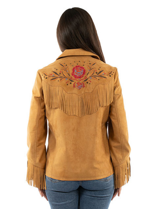 Women's Suede Fringe Jacket with Red Floral Embroidery