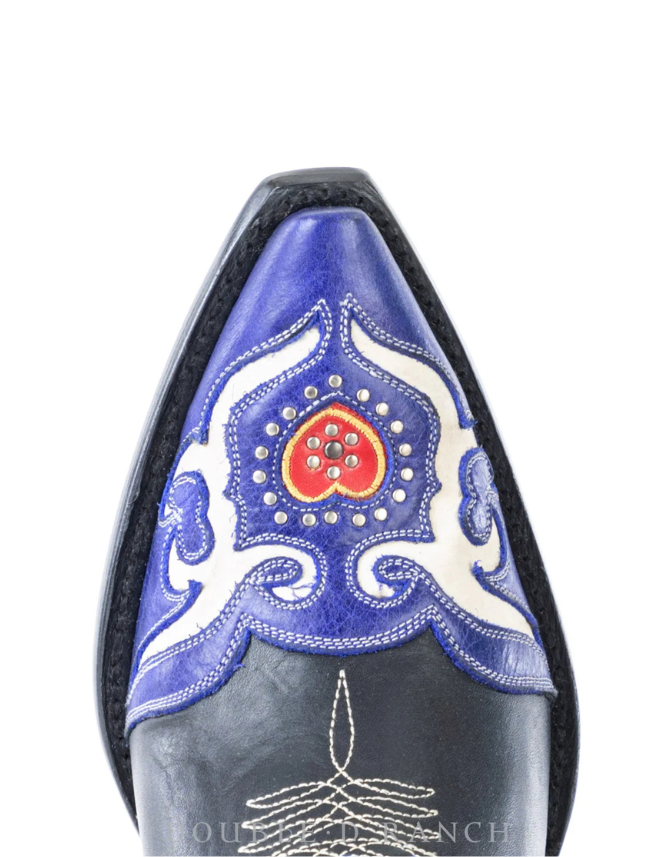 Dare to turn some heads with these bold beauties! The chic colorblock leather is a crisp cowgirl look that’s really kicked up a notch with the inlay image of a horseback cowboy on a buckin’ bronc. They’re embellished with traditional touches like contrast stitching, leather lacing, and flat metal studs, with some subtle heart details snuck in. You’ll be the talk of the town from the rodeo to Rodeo Drive!