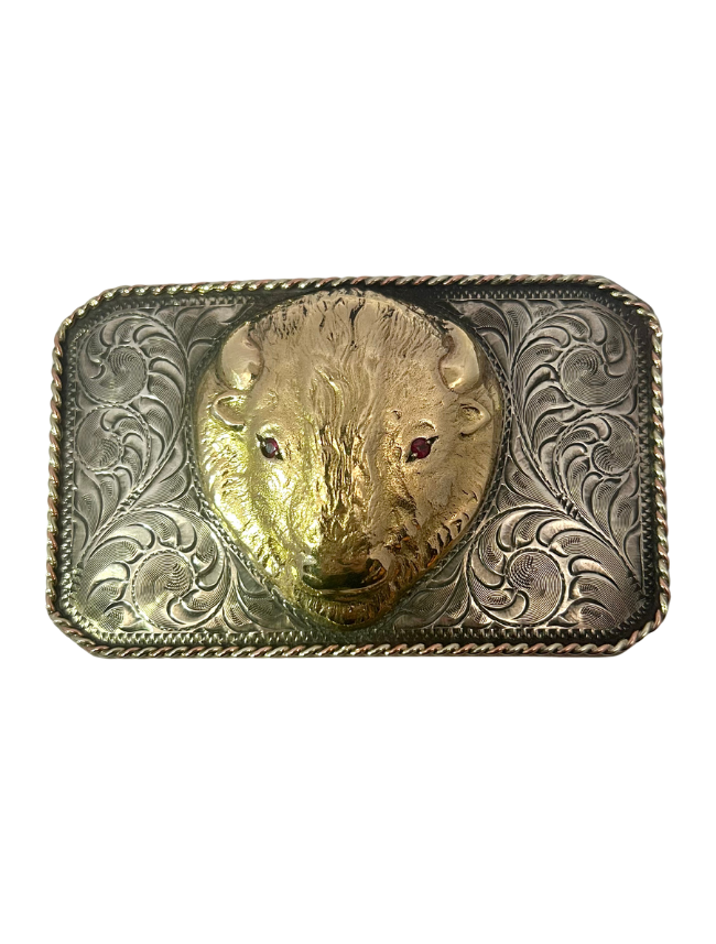 This striking, rectangular shaped, intricately floral engraved, sterling silver and 14K gold buffalo head buckle with ruby eyes and twisted gold rope edge measures 2" x 3 1/4" and is near-new condition. Stamped with the Edward H. Bohlin / Hollywood, CA shield maker-mark.