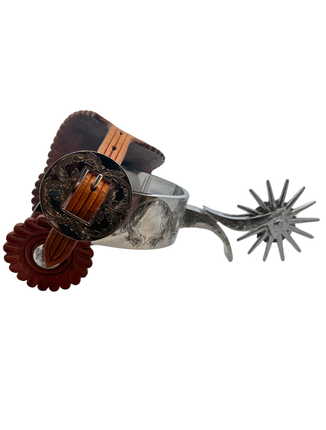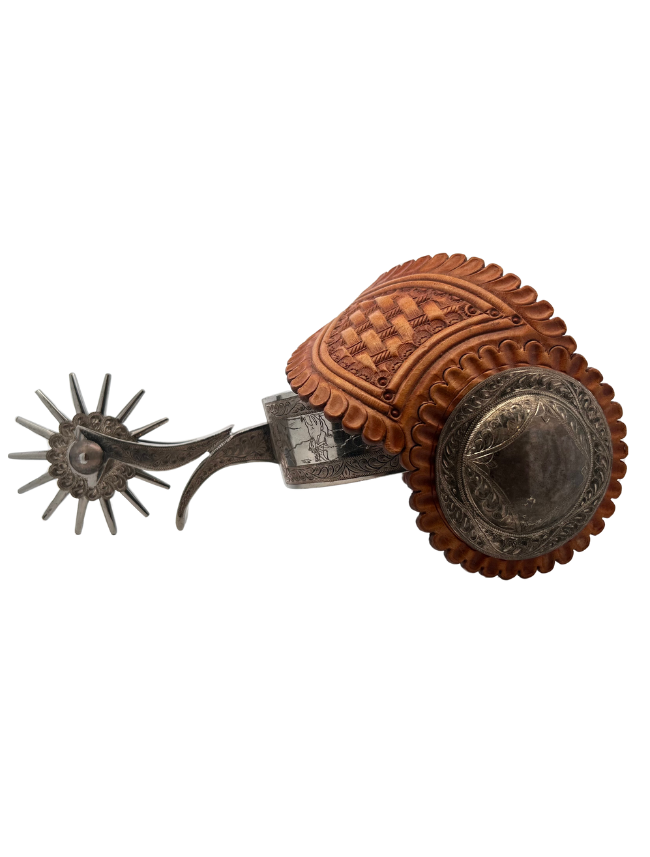 The large 1 3/8" band is intricately engraved on a full sterling overlay side panel with a gold frame. The engraving depicts a cowboy roping a steer in the manner of a famous Charlie Russel painting. Features 14 point rowels with fancy washers and 2 1/2" domed conchos.