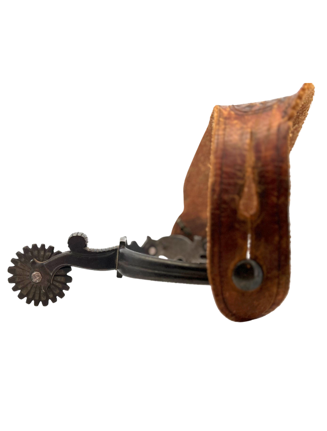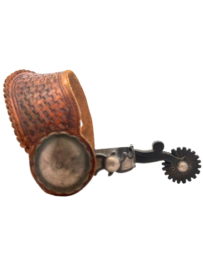 A pair of iron & silver inlaid spurs made by Daro Floof & marked on the rear of the bands "DARO." Made in a stylized double crescent pattern with central silver domes on 1 " bands & sweeping artistic 2 1/4" shanks, they also feature period basket stamped dove wing type straps with 2 1/4" conchos.