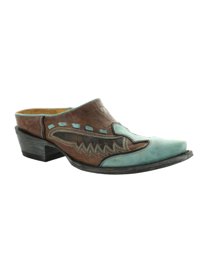 If you like unique and classy Western Lifestyle Fashion, check out these Old Gringo Quiroga Mule in Brass AQUA, designed for comfort and style. These quality mules are made of distressed brass leather with a turquoise overlay and a leather-stacked heel.