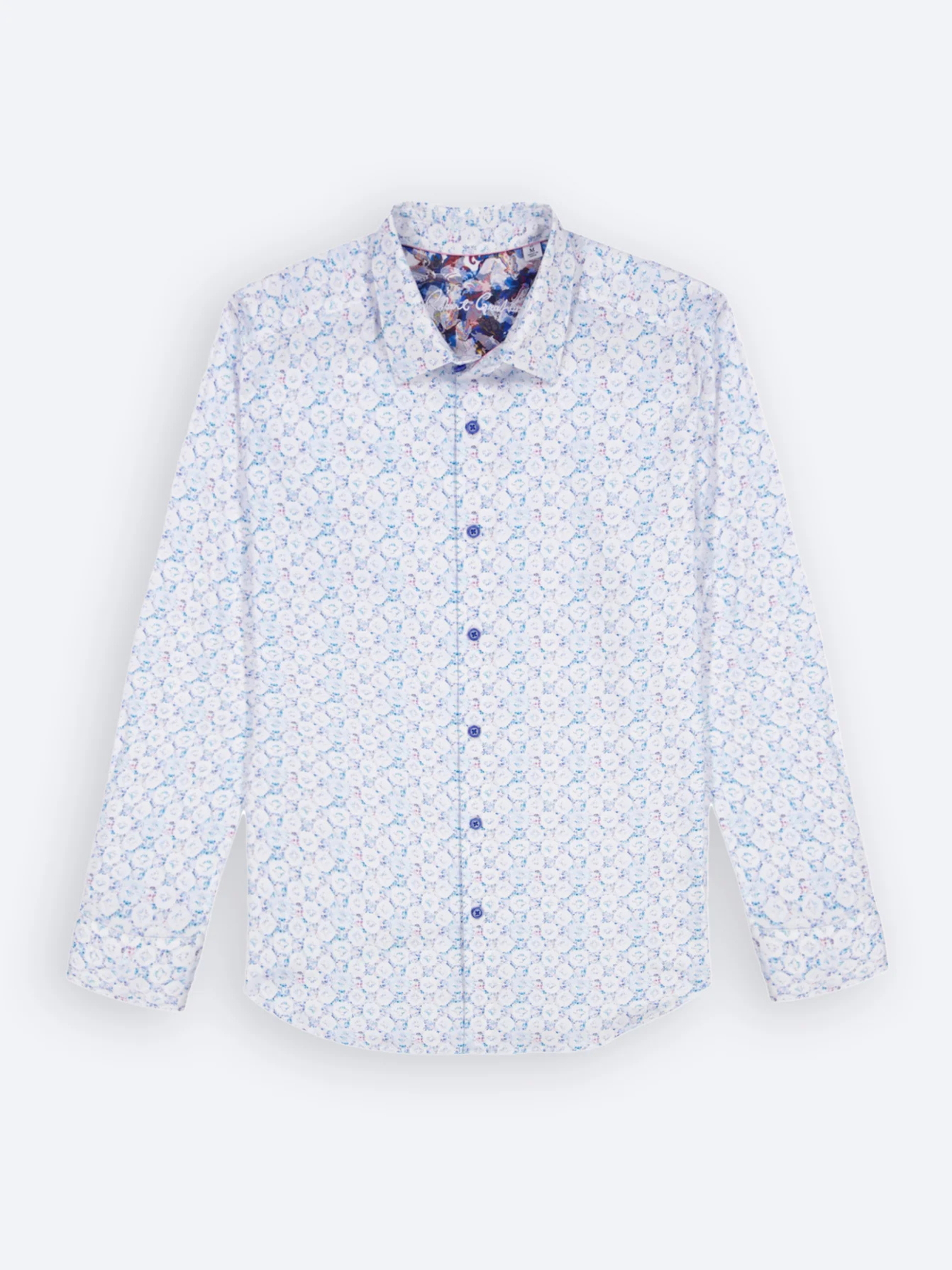 The Bramston is a mosaic of quiet complexity, crafted in smooth cotton satin for a soft touch and subtle sheen. At first glance, the pattern is a tonal geometric print but look closer and vibrant hues shimmer just beneath the surface, like stained glass in sunlight. Watercolor prints at the collar and cuffs offer a bold finishing note, turning every detail into a brushstroke of personality.
