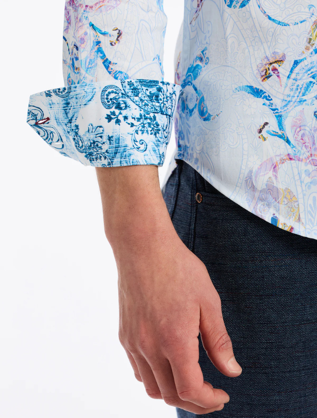 Elevate your wardrobe with this tasteful take on a classic paisley print. Soft-hued paisleys dance across this button-down, with an oversized pattern floating softly in the background. Add an extra layer of interest to your wardrobe with this unique piece.