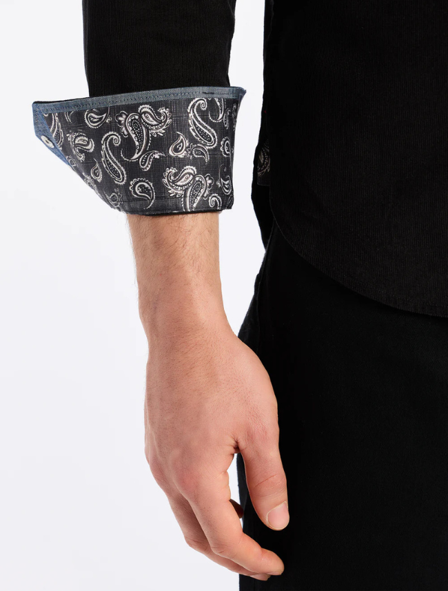 This long sleeve corduroy shirt brings rugged charm to any look. Featuring a Western-inspired yoke and snap buttons down the front and cuffs, it offers a distinctive look that's at once stylish and functional. A contrast paisley print at the inside cuffs adds that RG finishing touch.