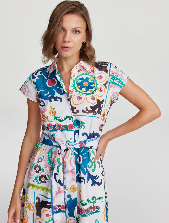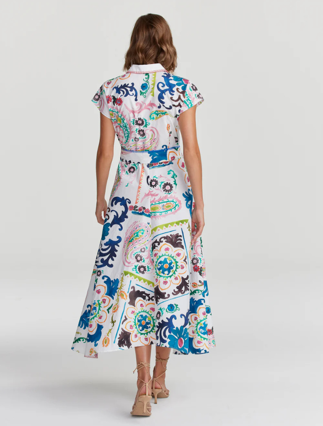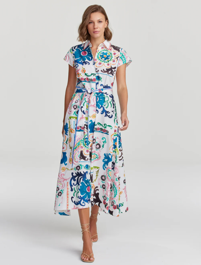 An elegant maxi dress becomes an instant showstopper in a standout block paisley print. Vibrant color keeps the eye moving from the large florals to the contrast edge embroidery at the collar. Cinch the belt to give your waist definition.