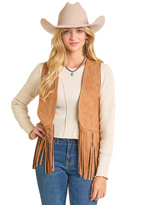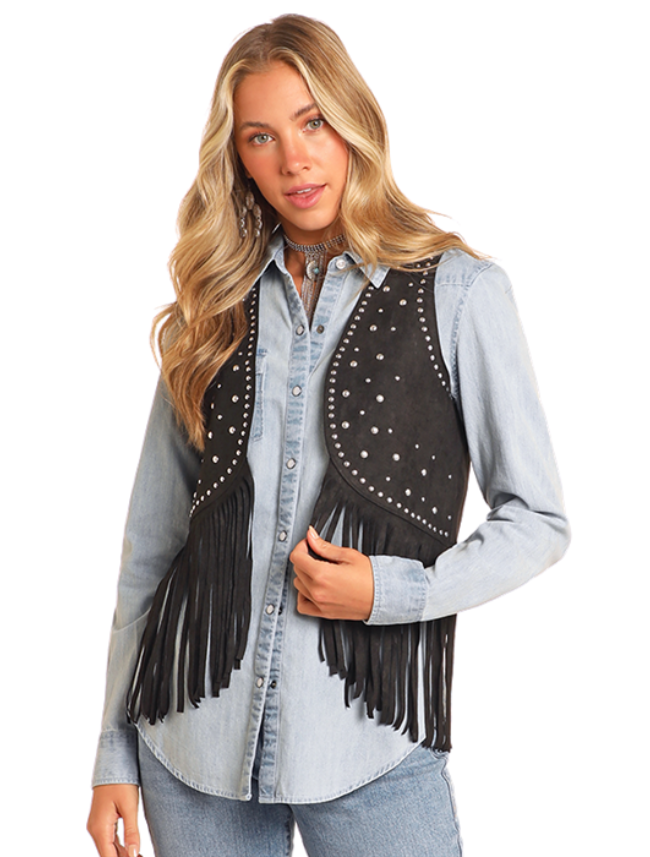 Rock & Roll Denim Women's Studded Vest with Fringe
