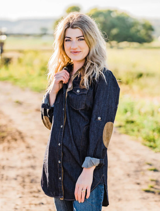 This is a shirt jacket that will comfortably double as a tunic. Finished off with micro suede accents, slant pockets, and elbow patches.