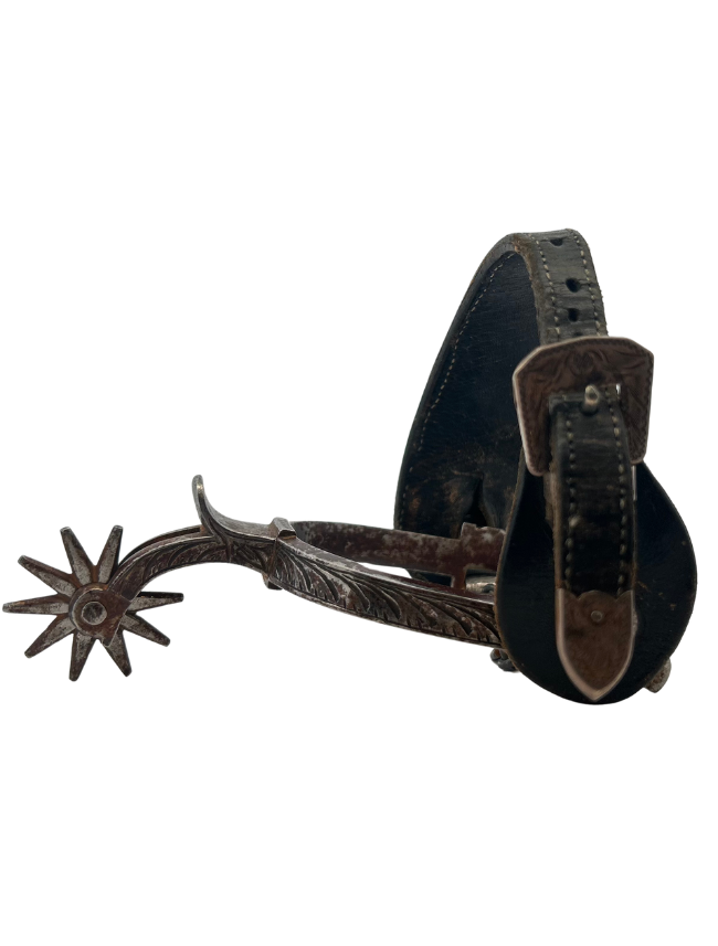 A very elegant pair of unmarked, silver inlaid spurs with deep scroll engraving on beveled 1/2" bands. The off side is chased in the classic manner of deep cuts. Double step down heel chains on swinging hangers. Very nice overall with attached vintage straps assembled with sterling buckle sets and scalloped conchos.