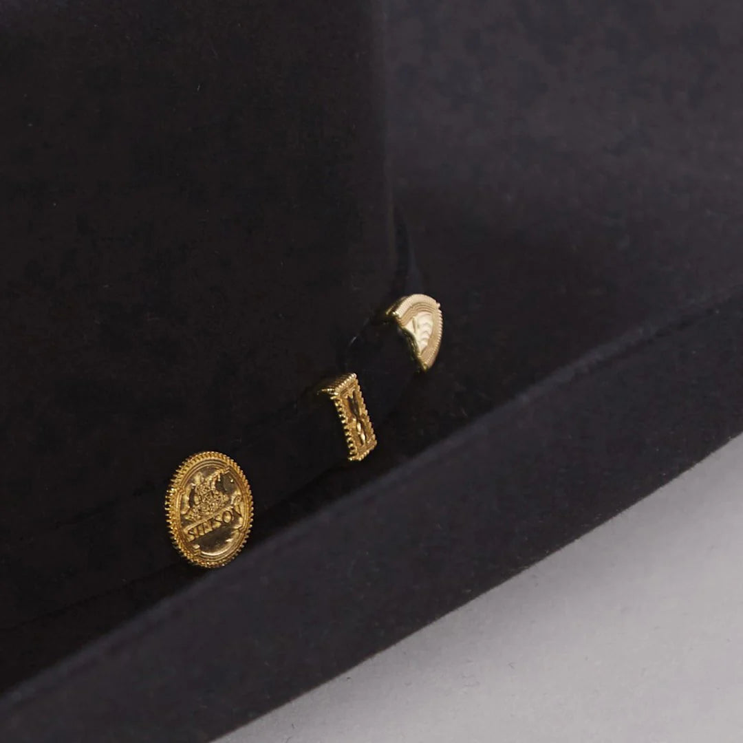 One of the finest hats in our collection, the El Presidente is made from premium 100X fur felt. A shining example of the legendary craftsmanship Stetson is known for, this incredibly high-quality piece features classic cattleman hat styling, with a tall crown and 4” wide brim. Made in the U.S.A., the El Presidente has a soft, satin-lined crown and comfortable 2” leather sweatband — on the outside, a self-felt hatband dyed the same distinctive hue as the body of the hat is set apart by a three-piece buckle set made of solid 10-karat gold. Part of Stetson’s Premier Collection, this hat exudes a quiet confidence and rugged fortitude that sets it apart from the crowd. Comes with heavy duty hat case.