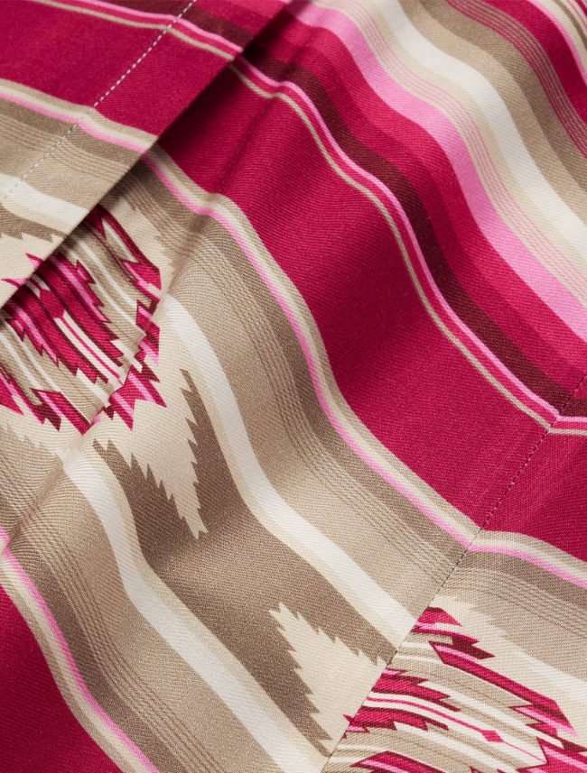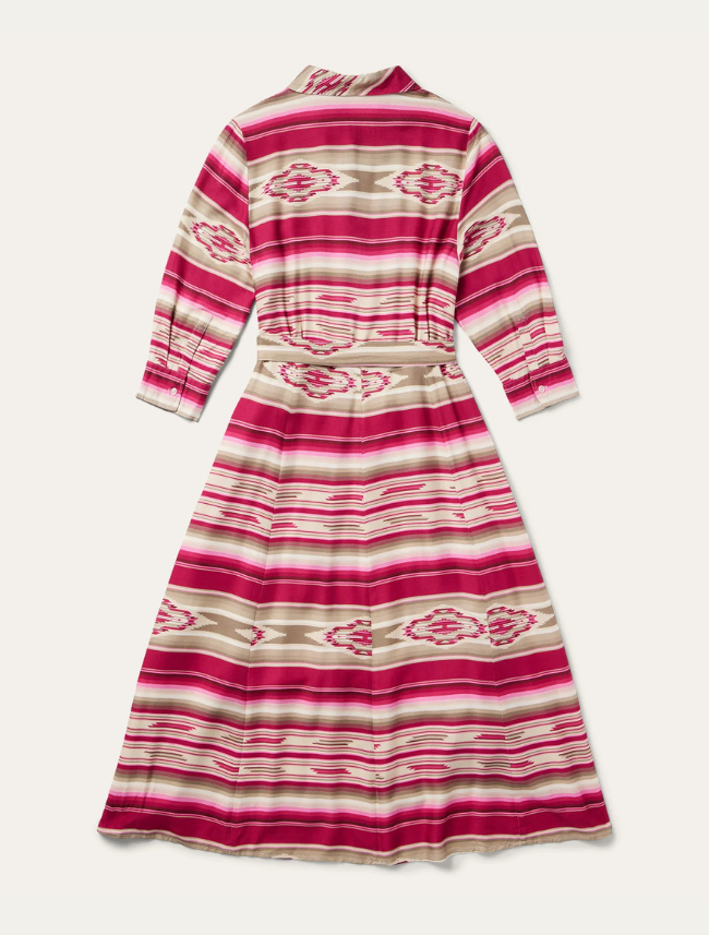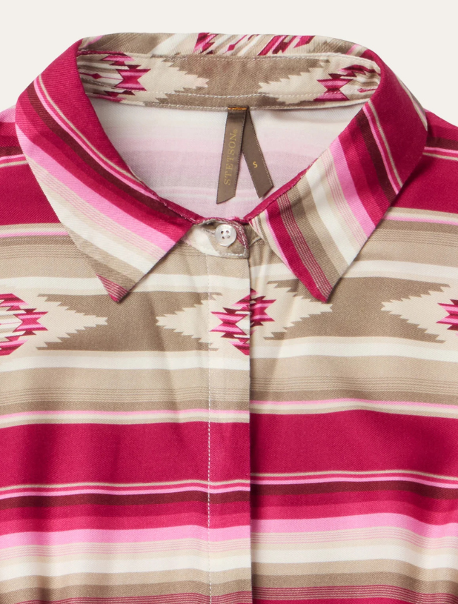 This vibrant mid-length dress is crafted from 100% rayon, which has a smooth, silky feel and features Stetson's exclusive western-inspired Scarlet Serape print. It has a fold down collar with full length hidden button placket closure, 3/4 length sleeves with gathers and button cuffs, and a fitted waistline with gathers and self fabric tie. Cut with an easy, flattering drape, the dress allows for all-day comfort and freedom of movement.