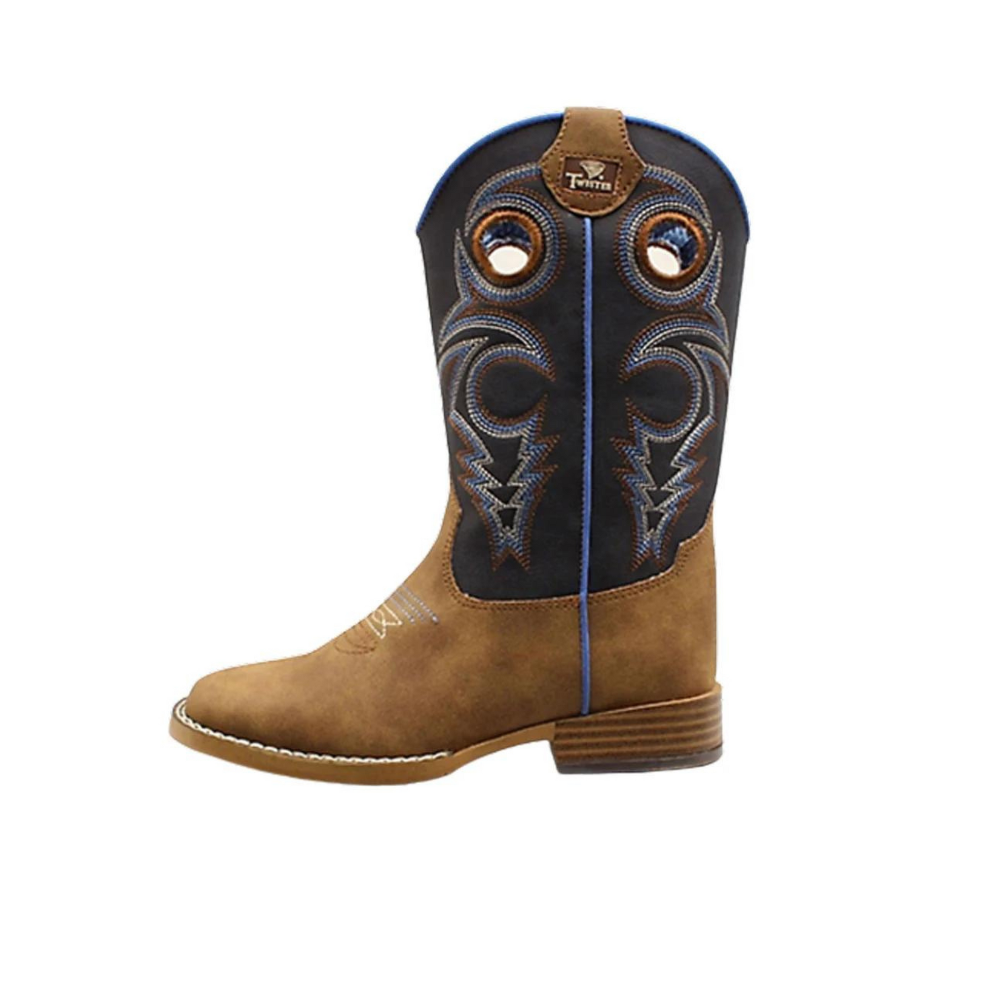 Twister presents these brown and navy square toe western boots. These boots have pull holes and straps, a zipper down the side and a block heel.
